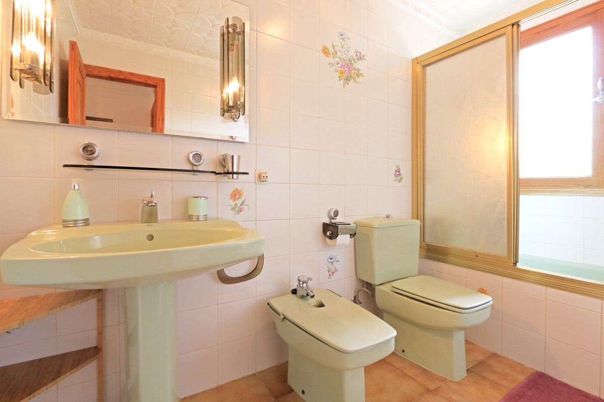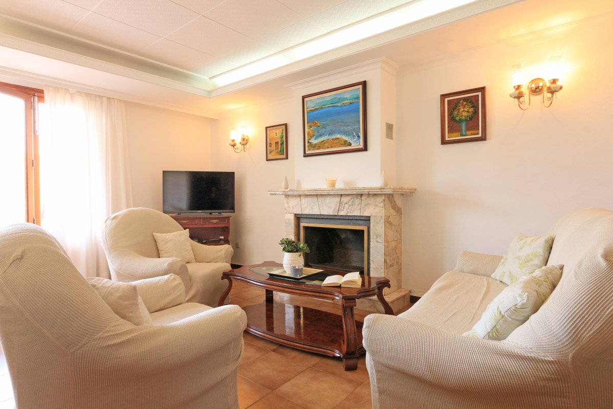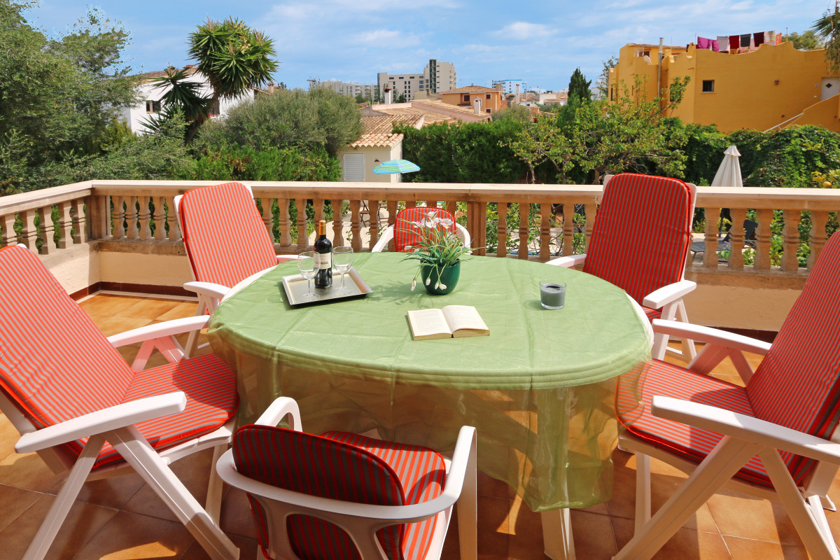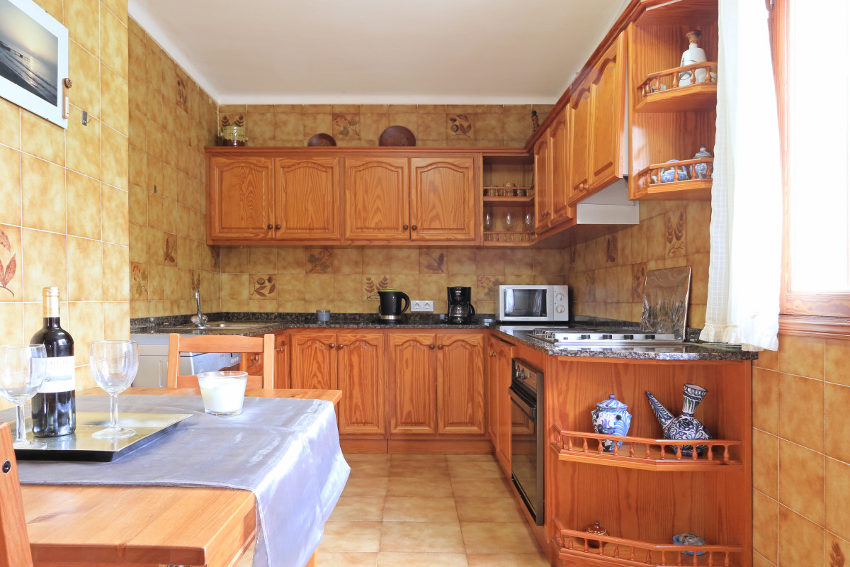 Eine große Auffahrt führt zum Haus, das über ein Treppenhaus betreten wird. Im ersten Stock erwartet Sie ein geräumiges Wohnzimmer mit deutschem Sat-TV und WLAN. Ein heller Essbereich und der Zugang zur großen Terrasse bieten einen herrlichen Blick über das Wohngebiet. Die angrenzende rustikale Küche ist komplett ausgestattet. Auf dieser Etage befindet sich ein Schlafzimmer mit mallorquinischem Doppelbett und ein Badezimmer.