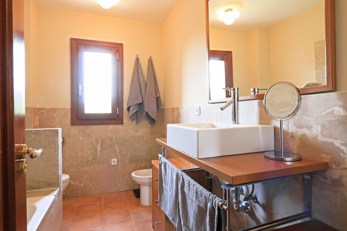 Über das Treppenhaus erreicht man in der oberen Etage die drei Schlafzimmer und ein weiteres Badezimmer, dieses mit Badewanne und Bidet. Zwei der Schlafzimmer sind mit Einbauschränken und jeweils einem Doppelbett, das dritte Schlafzimmer mit einem Einzelbett möbliert, welches mit einem eingepassten Ausziehbett über einen zusätzlichen Schlafplatz verfügt und ideal für Kinder und Jugendliche geeignet ist.